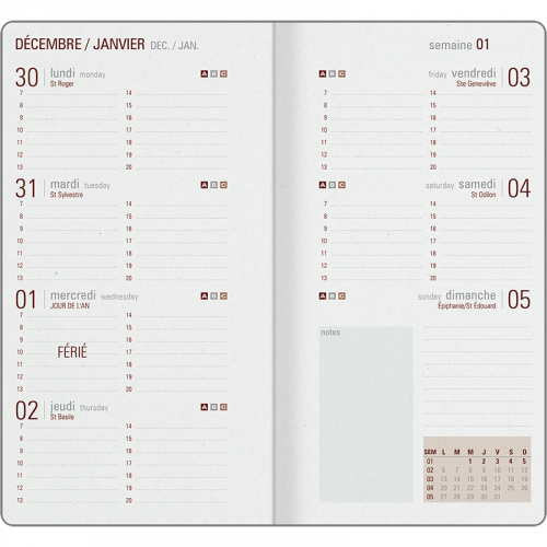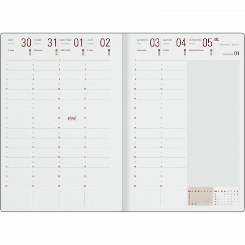 La semaine sur 2 pages imprimée marron et gris sur papier blanc 70 grammes, à la verticale sur les formats Grand et Moyen et à l’horizontale sur le format Poche.
