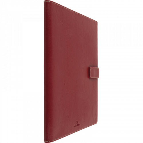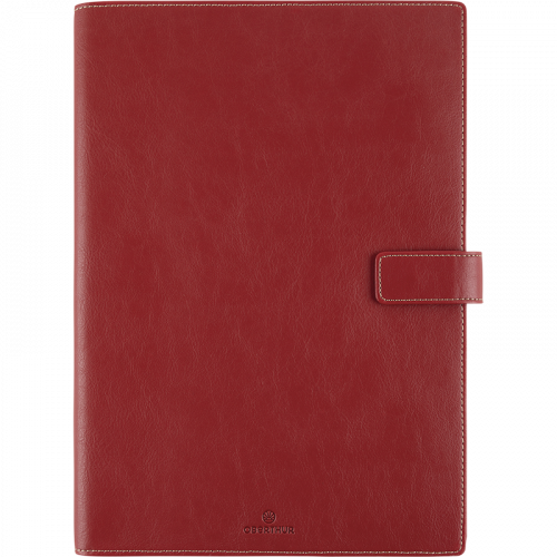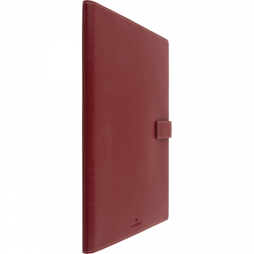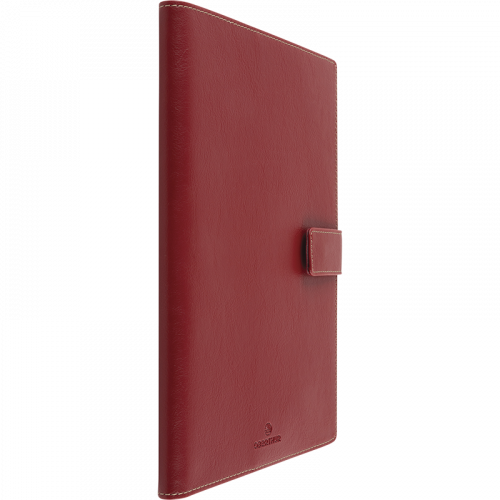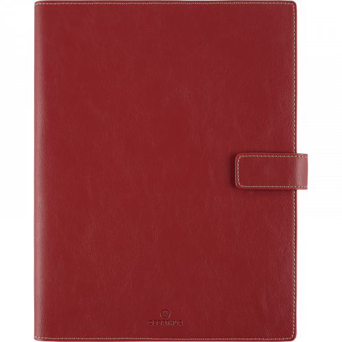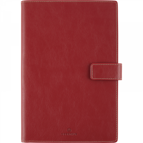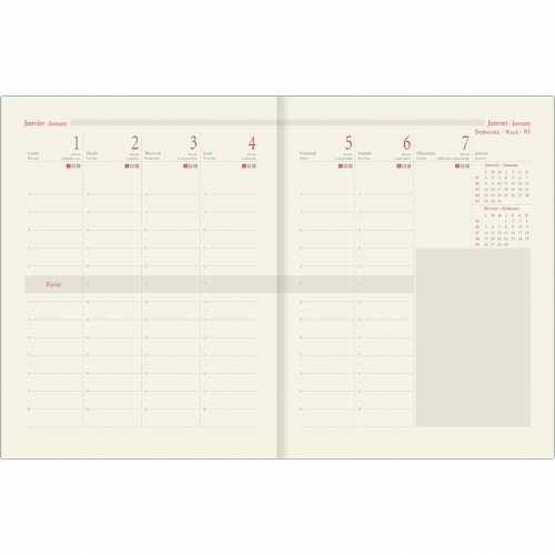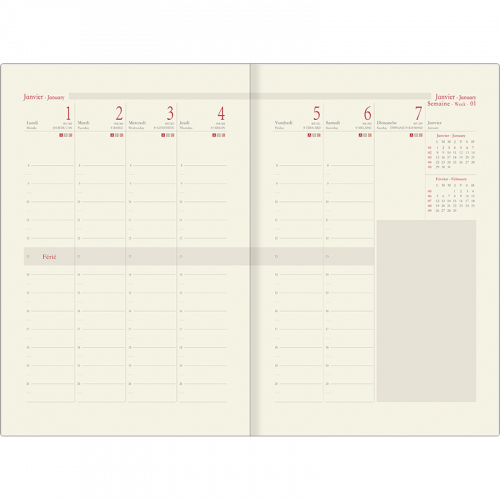Intérieur broché impression rouge et gris sur papier ivoire, la semaine sur 2 pages, coins perforés, répertoire amovible.
