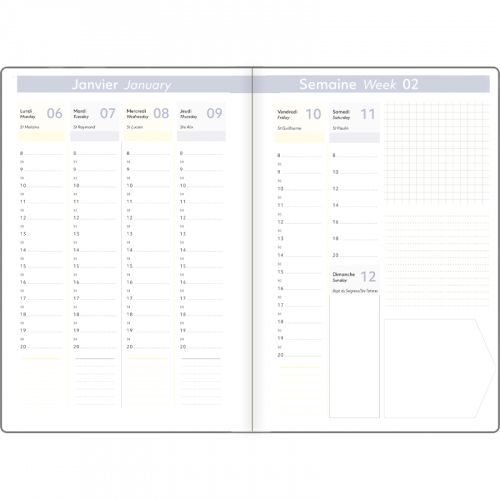 Grille fantaisie : La semaine sur 2 pages imprimée en couleurs sur papier blanc 70g avec un duo de couleurs par saison.
