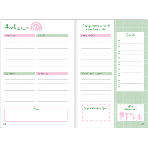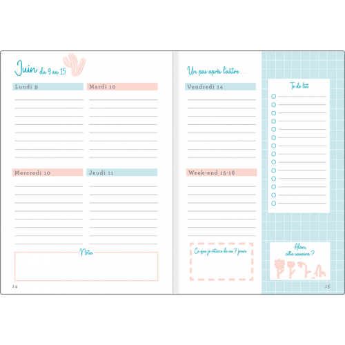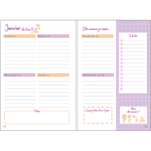 Grille fantaisie : La semaine sur 2 pages avec 1 bloc par jour du lundi au vendredi et 1 bloc pour le week-end. Nombreux espaces de notes, jeu de couleurs suivant les saisons