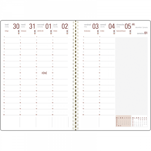 La semaine sur 2 pages imprimée marron et gris sur papier blanc 70 grammes, jour à la verticale.
