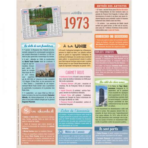 Localiser un magasinIl devient de plus en plus difficile, les années passant de trouver une façon originale de souhaiter un anniversaire! C'est pourquoi,nous avons conçu un produit particulièrement adapté aux personnes passant le cap d'une dizaine. En plus d'une reproduction de couverture d'almanach d'époque, ils découvriront tous les événements politiques, économiques, sportifs, météorologiques... qui se sont déroulés lorsqu'ils avaient 10 ans, 20, 30... ainsi que les évènements avant leur naissance. Accroche intégrée à la couvertureIntérieur : 12 pages en couleur, présentant tous les événements marquants de l'année culturels, politiques, sportifs, économiques etc... des années en 3 (de 1923 à 2013).