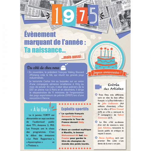 Localiser un magasinEnvoyez cette carte pour souhaiter un anniversaire ! Vous pourrez écrire un petit message à l'intérieur. En plus de votre mot, le destinataire pourra retrouver les grands événements économiques, politiques, sportifs... qui ont marqués l'année de sa naissance.