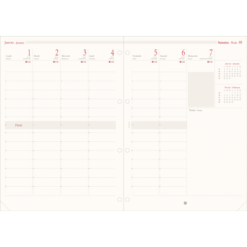 Livré avec un intérieur 2026 imprimé rouge et gris sur papier ivoire, la semaine sur 2 pages, coins perforés.