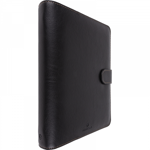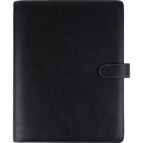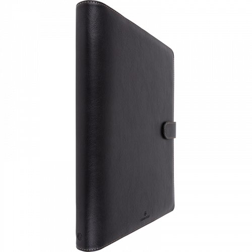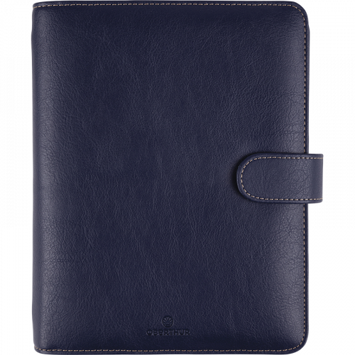 Garnissage enrichi : 1 coulisseau porte-stylo, 1 garde protectrice, 10 feuillets lignés ivoire, 10 feuillets lignés bleu, 6 feuillets d'informations, 10 feuillets "contact", 7 intercalaires de rubrique en plastique de couleur, 12 intercalaires alphabétiques en plastique gris, 20 feuillets répertoire, 1 pochette porte-cartes de visite, 1 pochette porte-documents, 1 bloc-notes papier ivoire, coins perforés.