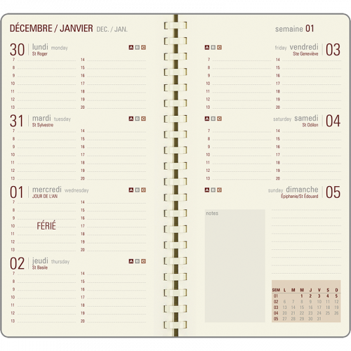 Semainier international (FR, GB, D) reliure peigne ivoire, la semaine à l'horizontale.