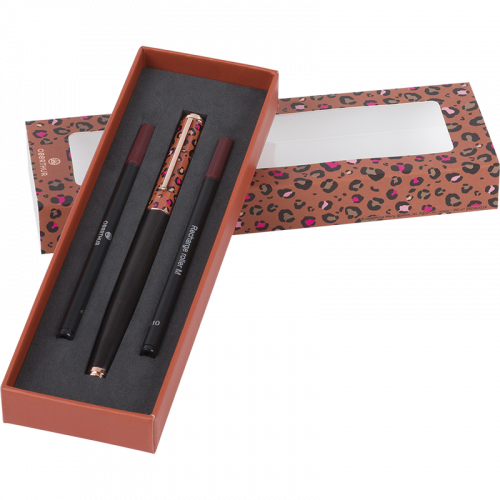Présenté dans un coffret assorti au motif léopard, il comprend deux recharges roller compatibles, prêtes à l’emploi. Un accessoire pratique et soigné, parfait pour le bureau ou pour offrir.