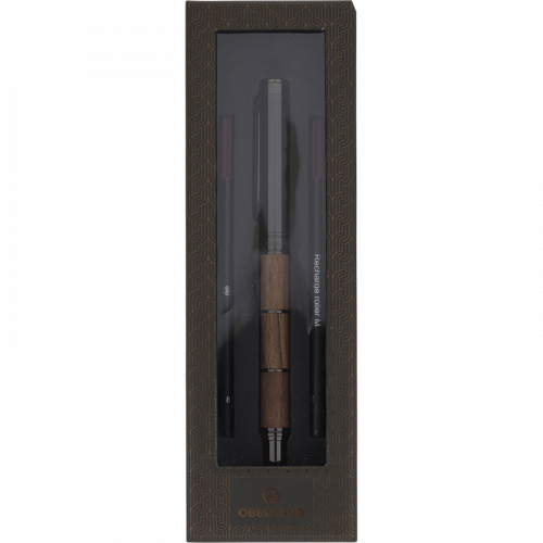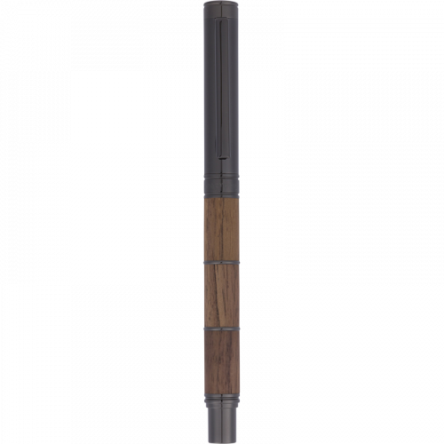 Corps en bois de noyer (marron) avec anneaux métalliques, et capuchon en métal.